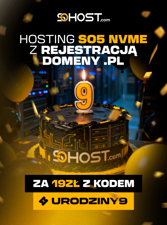 9 urodziny sohost Z tej okazji przygotowaliśmy specjalny kod rabatowy na hosting! Z kodem URODZINY9 pakiet SO5 NVMe z rejestracją domenę za 19zł brutto! Kod jest ważny tylko dzisiaj tj. 17.03.2026. -
